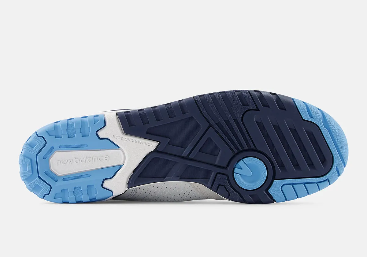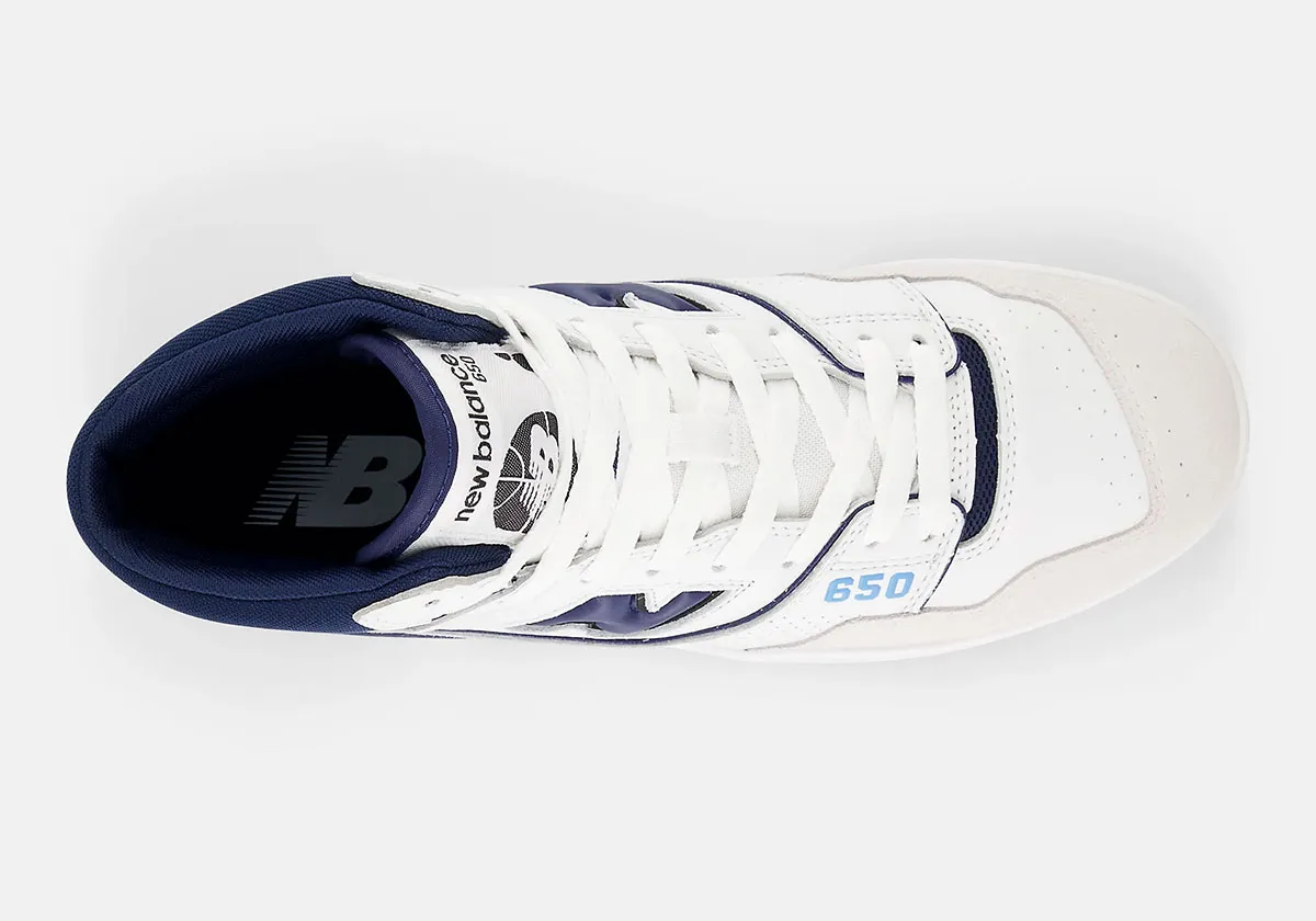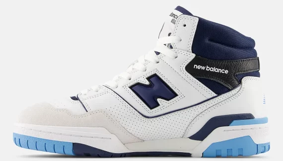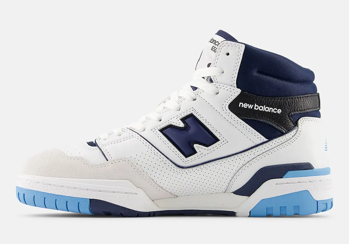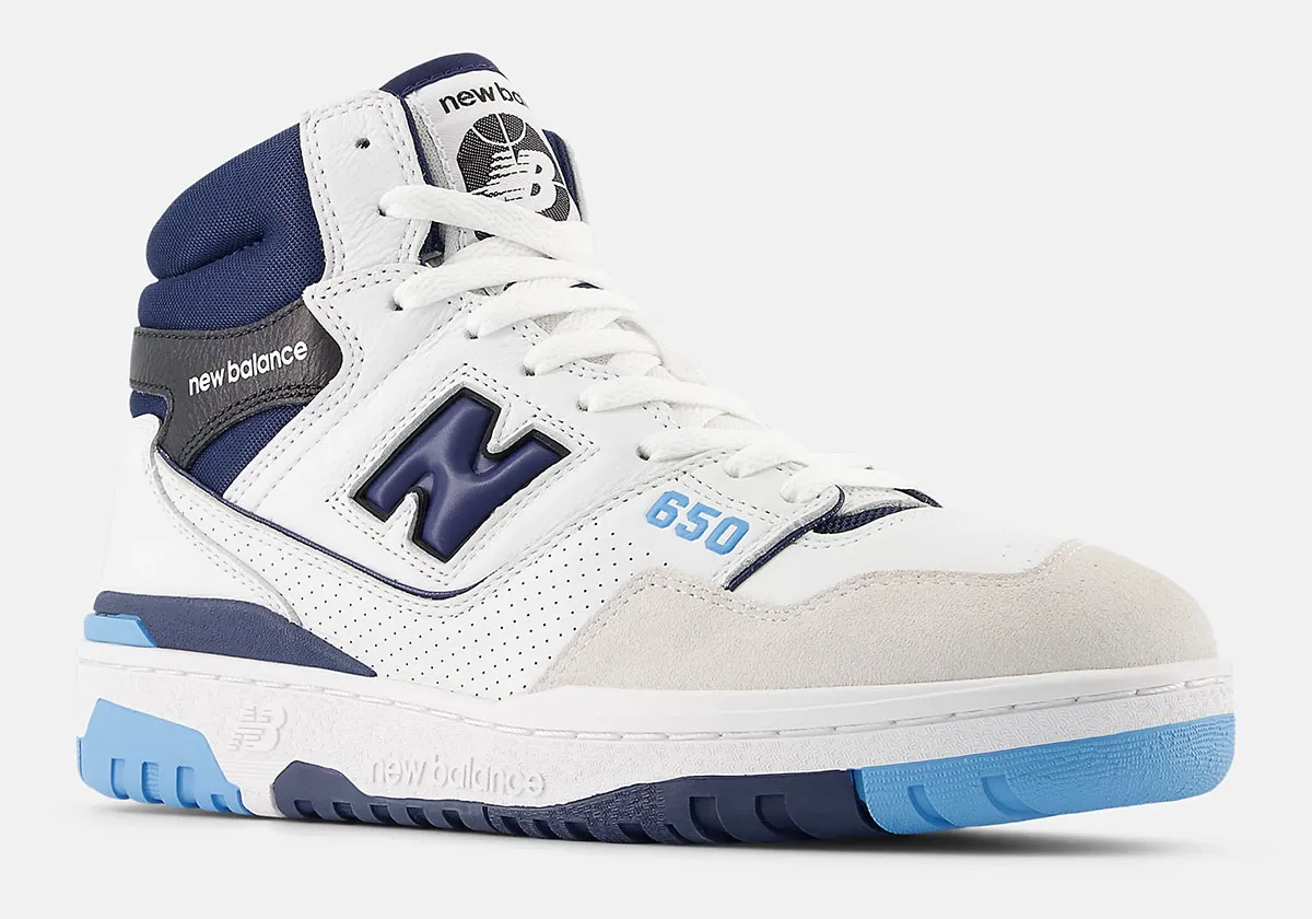 Ce coloris UNC reprend donc les couleurs des Tar Heels de Caroline du Nord, l’état de naissance de James Worthy qui a également joué pour la fac d’UNC de 1979 à 1982 avant de rejoindre les Lakers. La tige blanche est ornée de compléments en bleu marine et bleu clair, au niveau du col, de la base du talon et pour faire ressortir le N de New Balance en bleu marine sur l’empeigne, et le 650 en bleu clair. L’avant de la chaussure est doté d’une superposition en daim.