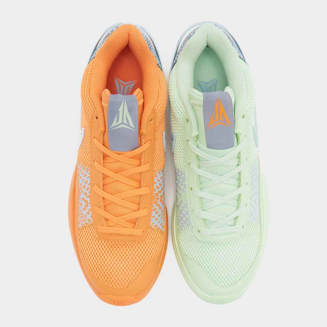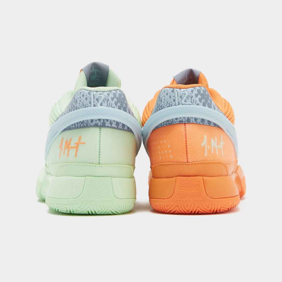 Cette fois, la marque à la virgule a opté pour du vert pâle sur la chaussure gauche et du orange pour la chaussure droite. La paire est complétée par du gris, sur le « Swoosh » et la languette notamment, tandis que les signatures et inscriptions apparaissent sur chaque chaussure dans la couleur opposée, en orange sur la gauche et en vert sur la droite.