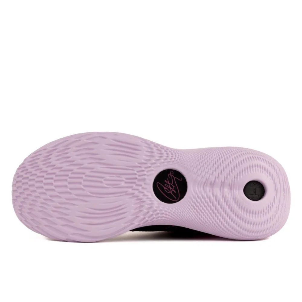 Celui-ci se distingue par une tige en noir et rose complétée par un support en TPU violet pour renforcer le talon. On retrouve deux tons en violet « lavande » pour habiller la semelle UA Flow, sur laquelle le logo de la superstar des Warriors apparaît en blanc. .