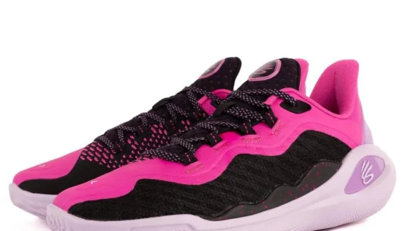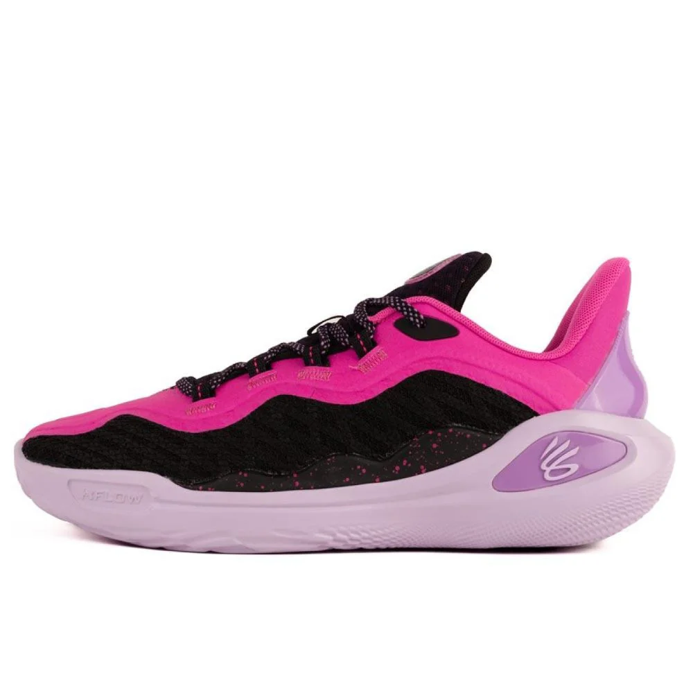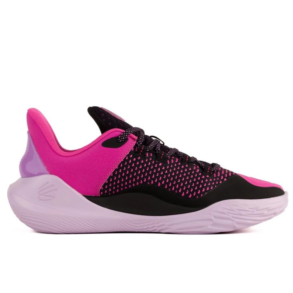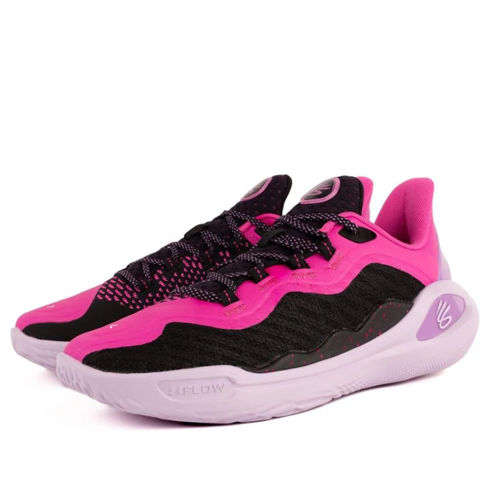 Celui-ci se distingue par une tige en noir et rose complétée par un support en TPU violet pour renforcer le talon. On retrouve deux tons en violet « lavande » pour habiller la semelle UA Flow, sur laquelle le logo de la superstar des Warriors apparaît en blanc. .