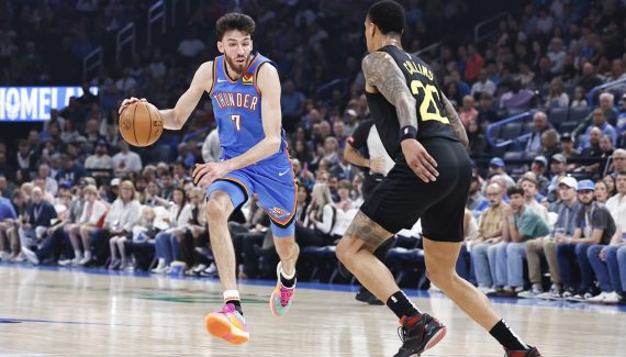 C’est peut-être le meilleur match de sa saison pour le rookie du Thunder, qui échoue à seulement une unité de son record de points (36 contre Golden State) et égale aussi son record de rebonds.