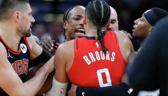 On est dans le troisième quart-temps de la rencontre et alors que Chicago était revenu à deux petits points, Houston refait l’écart. Le leader de Chicago s’est fait contrer par Jalen Green sur une contre-attaque. Dans la foulée, il a raté un layup, avec sans doute une faute non sifflée de Dillon Brooks. Alors, sur la remontée du ballon texane, il vient commettre une énorme faute sur Jalen Green, aux allures d’exutoire et de message.