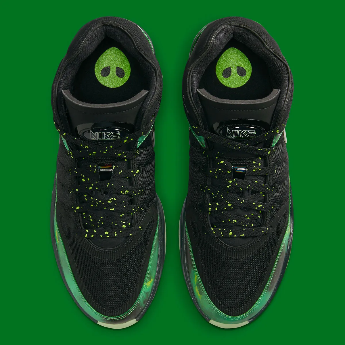 La tige principalement noire est recouverte d’un motif “galactique” en nuances de vert, à sa base, au niveau du talon et du col, tandis que le “Swoosh” ressort en gris chromé. La semelle extérieure phosphorescente comporte la mention “Be Unique Every Day”, tandis qu’un logo “Alien” complète l’ensemble sur le talon.