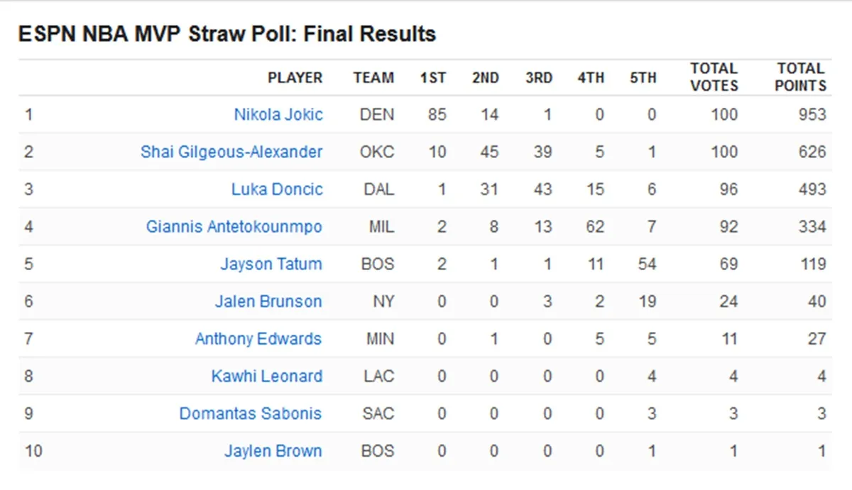 85 journalistes ont ainsi donné la première place au pivot des Nuggets, contre seulement 10 pour le meneur de jeu du Thunder. Au final, le MVP 2021 et 2022 récolte 953 points, très loin devant les 626 de «SGA».