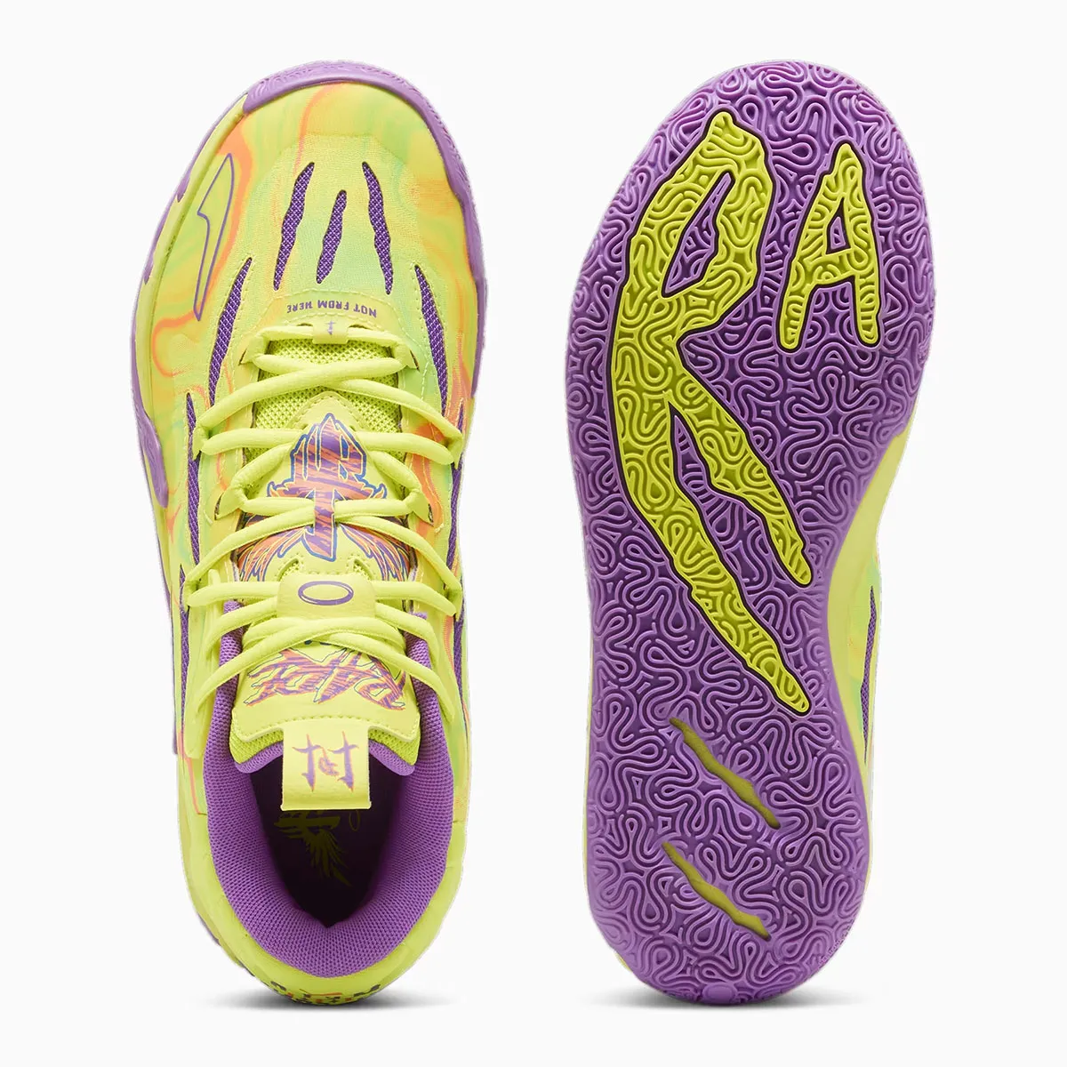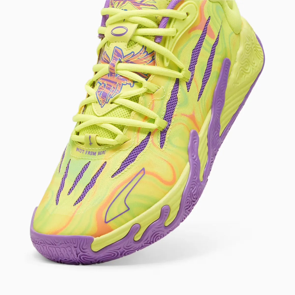 La tige s’articule entre jaune et vert avec des finitions en orage qu’on retrouve également sur le logo de la languette. Le reste ressort en violet, sur l’empeigne, l’intérieur du col et la semelle extérieure. Sur le talon, l’inscription M.E.L.O. Et 01 of One apparaît en violet tandis que le puma et le « 1+1+1 » est en orange.