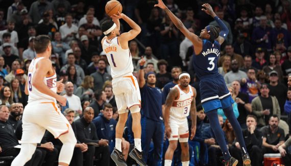 Après la défaite de Denver chez les Clippers, Minnesota avait l’occasion de faire le break en tête de tête de la conférence Ouest avec ce déplacement à Phoenix. Les partenaires de Rudy Gobert n’en auront pas profité, et ils ont tout simplement pris le match par le mauvais bout, à l’image de Naz Reid qui gâche deux contre-attaques lors des deux premières possessions. Il est d’abord contré par Jusuf Nurkic (11 points, 15 rebonds, 6 passes décisives, 3 interceptions) puis il rate son double-pas face à Bradley Beal. Sans pitié, les Suns punissent.