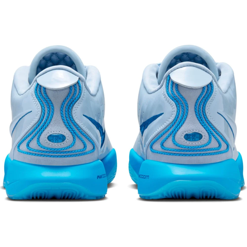 La tige principalement en gris clair est assortie de finitions en deux teintes de bleu. Le bleu plus clair ressort notamment sur la languette où figure la signature de LeBron James ou ou encore sur la semelle extérieure.