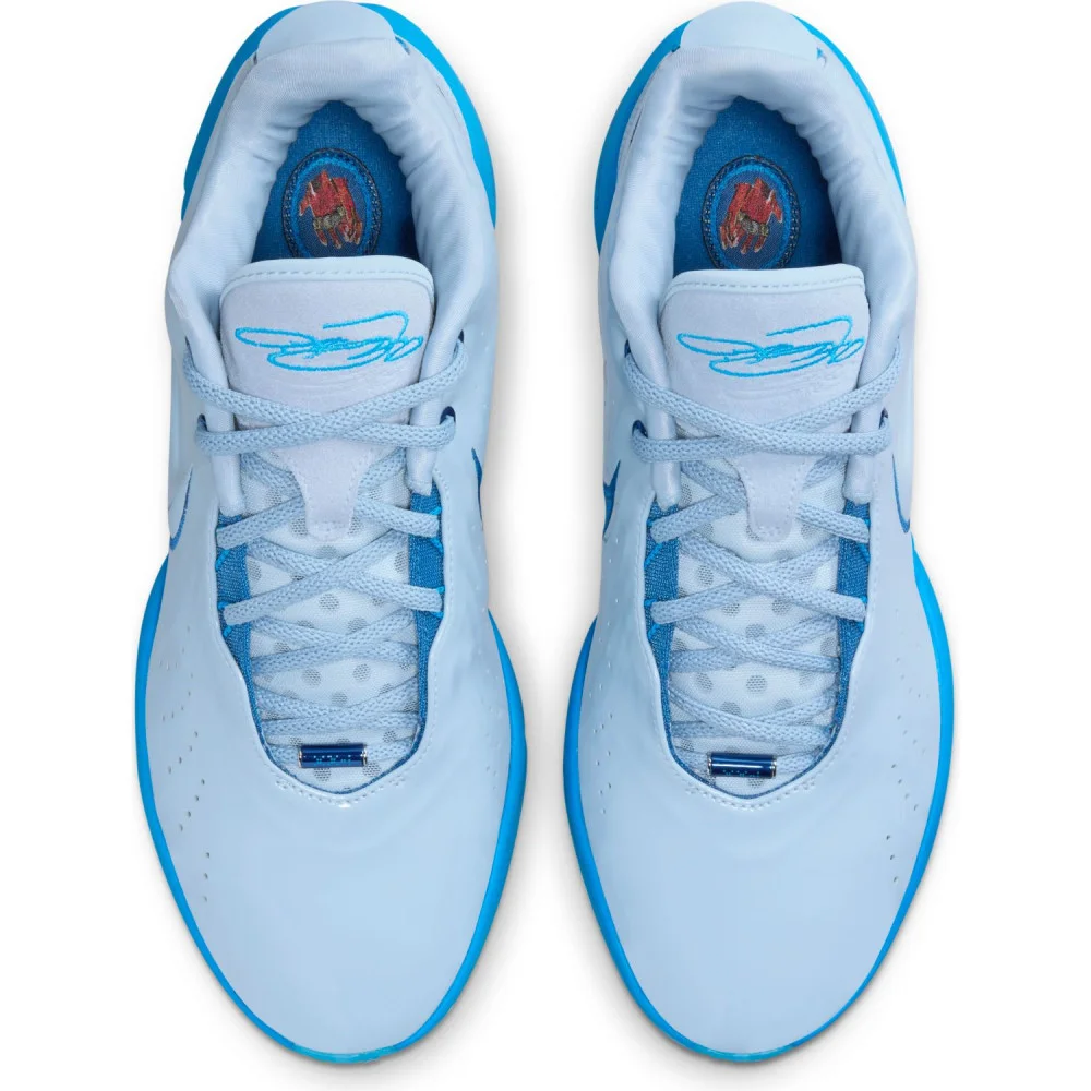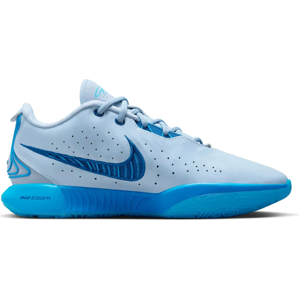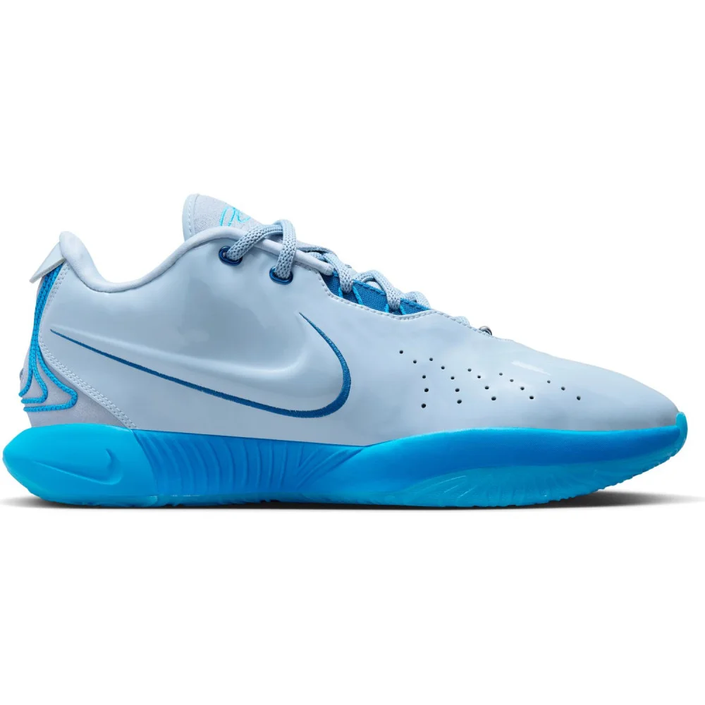 La tige principalement en gris clair est assortie de finitions en deux teintes de bleu. Le bleu plus clair ressort notamment sur la languette où figure la signature de LeBron James ou ou encore sur la semelle extérieure.
