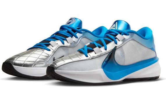 Nike a fait le job de son côté avec un coloris « Total Freak » plutôt réussi, avec la base de la tige blanche recouverte de bandes d’un bleu chromé, pour faire ressortir le « Swoosh » notamment, et gris métal, sur la partie supérieure et l’avant du pied. L’assortiment de blanc et de bleu vient également rappeler les couleurs du pays natal de Giannis Antetokounmpo : la Grèce. L’ensemble repose sur une semelle intermédiaire blanche et noire avec une touche de bleu et un « Swoosh » inversé en vert pâle au niveau du talon.