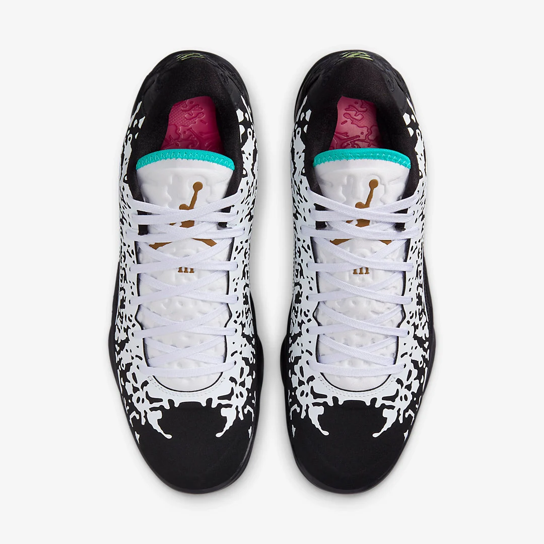 La tige principalement noire est tachetée de blanc dans un style à la « Venom ». La languette apparaît également en blanc avec un « Jumpman » marron doré et des contours en bleu turquoise. Au niveau du talon, on retrouve le logo du joueur ressortant en vert, avec également un nouveau « Jumpman », en rouge cette fois. L’ensemble repose sur une semelle extérieure en noir, avec des rappels en bleu ciel, et marron sous la semelle.