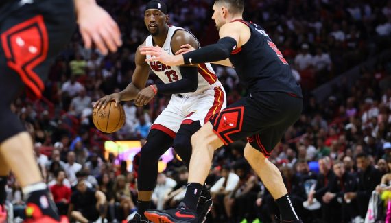 Situation inhabituelle pour DeMar DeRozan en tête de raquette. Ayo Dosunmu vient lui poser un écran, son défenseur Tyler Herro vient en opposition sur l’arrière des Bulls, puis file reprendre son joueur. Le Heat ne change pas en défense et… Bam Adebayo reprend le vétéran d’en face.