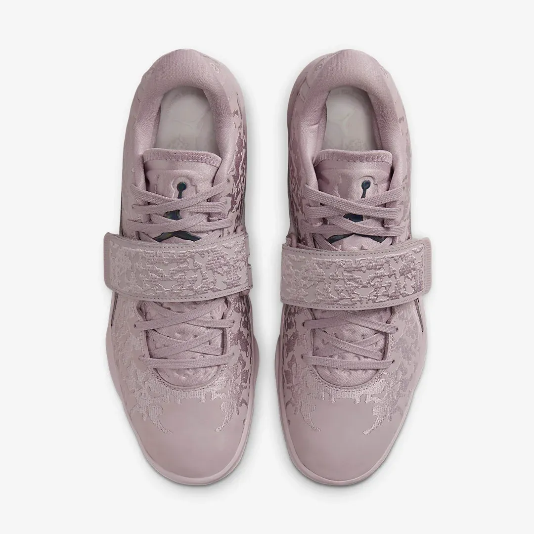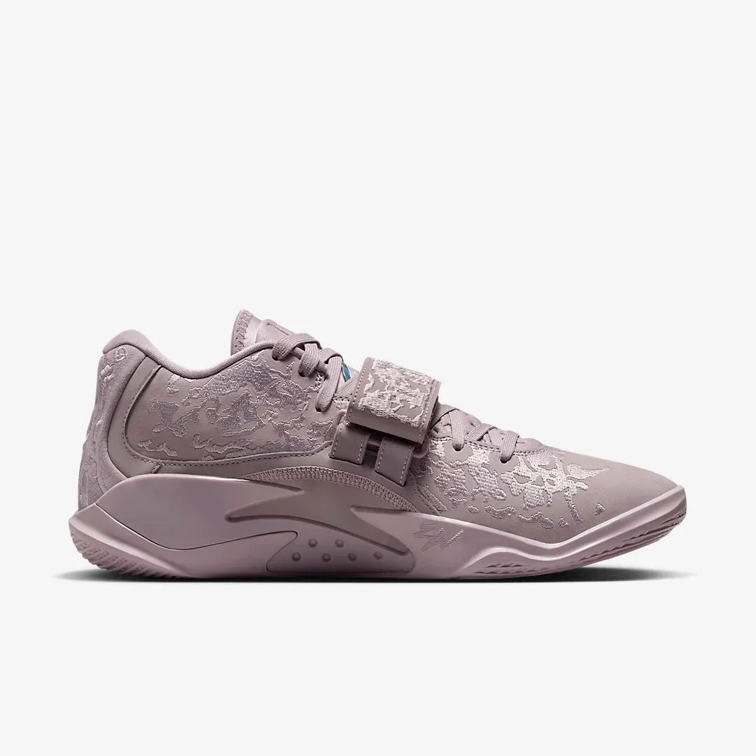 Baptisée Zion 3 “M.U.D.”, cette dernière a ainsi été dévoilée sous un coloris “Orchid”. Le modèle arbore un ton “orchidée” en violet pâle, recouvert de broderies sur l'ensemble de la chaussure, et donc la sangle. La même couleur recouvre la semelle, seul le Jumpman ressort en noir sur la languette et le talon.