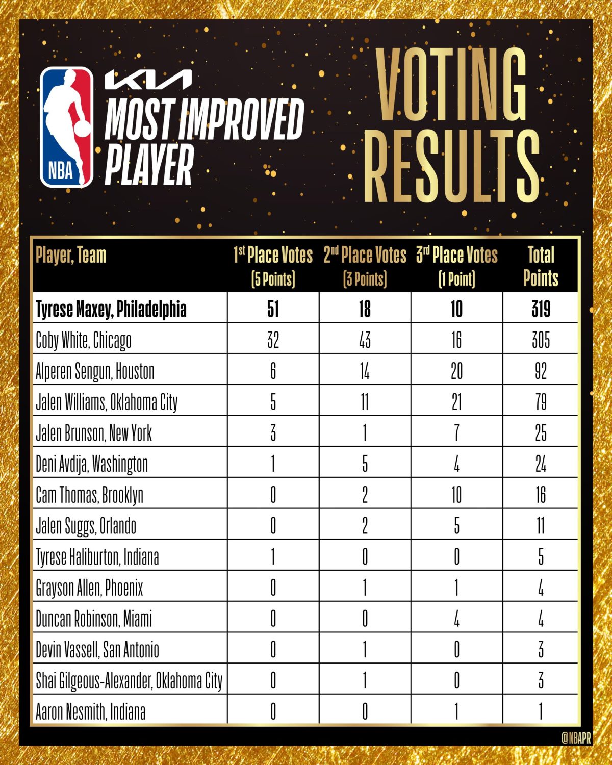 La NBA démarre sa traditionnelle distribution des trophées individuels de cette saison, avec celui de « Most Improved Player (MIP) ». Une distinction remportée cette année par Tyrese Maxey (319 points), qui succède ainsi à Lauri Markkanen.