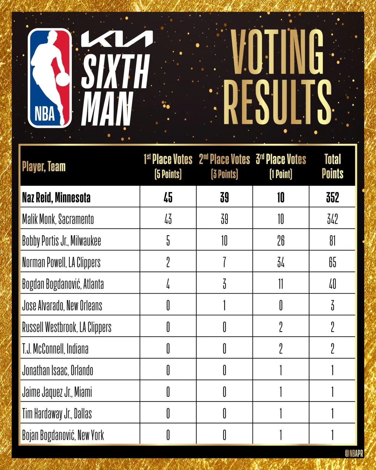 Finalement, c’est Naz Reid (352 points) qui triomphe avec seulement… 10 points et deux premières places d’avance sur Malik Monk (342 points). Du jamais-vu dans l’histoire de cette récompense !