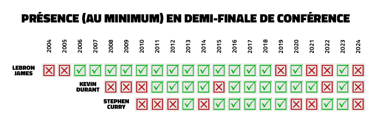 Pour Kevin Durant, ce sont huit qualifications de suite en demi-finale de conférence, de 2011 à 2019. Blessé au tendon d’Achille lors des Finals 2019, il retrouve les playoffs et les demi-finales de conférence en 2021 avec les Nets, puis en 2023 avec les Suns. En 2022 et en 2024, les Nets et les Suns sont sortis dès le premier tour.