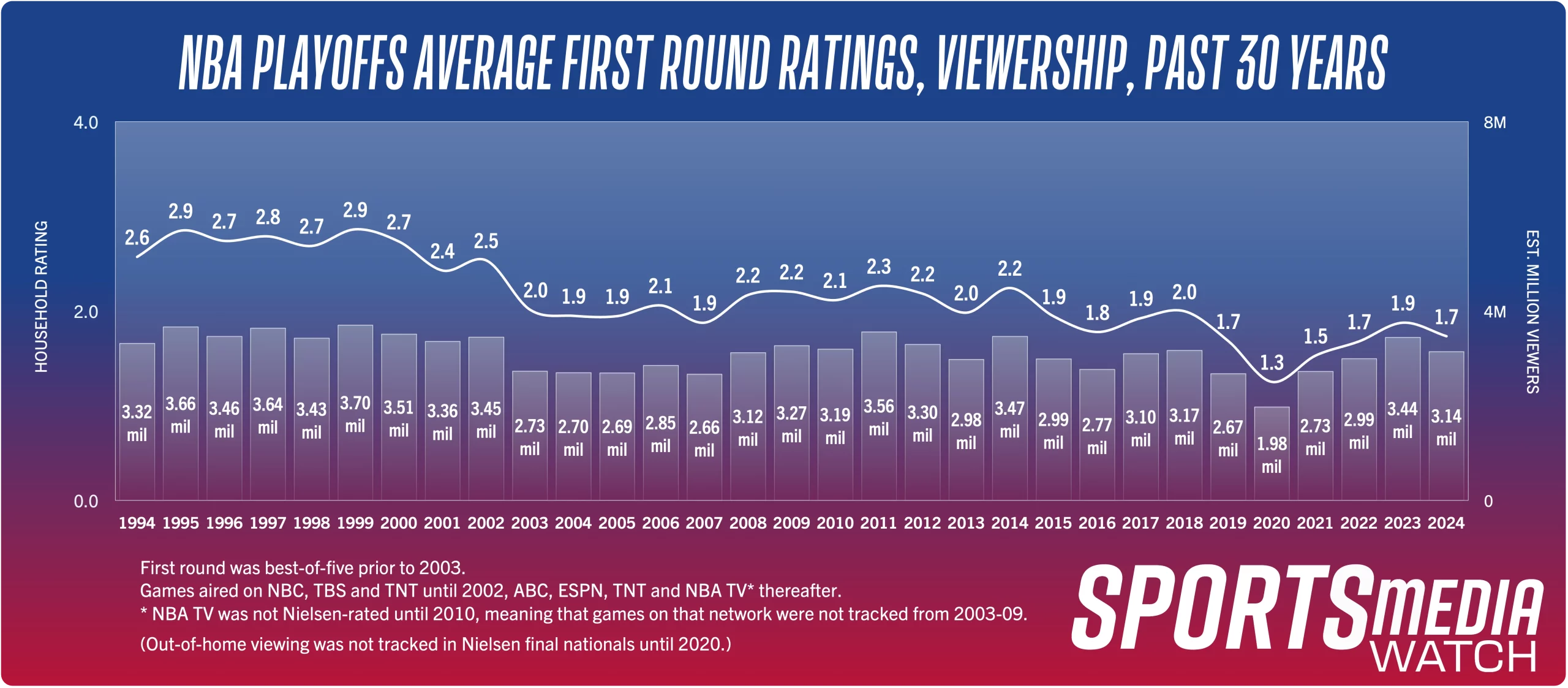 Ainsi, selon SportsMediaWatch, les matchs du premier tour ont attiré 3.14 millions de téléspectateurs de moyenne, sur les antennes de ABC, ESPN, TNT/truTV et NBA TV, pour 1.7% de parts de marché. Soit une chute de 8% par rapport au premier tour de l’an passé, qui avait lui été suivi par 3.44 millions de téléspectateurs en moyenne.