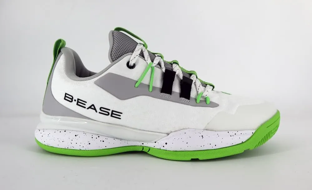 L'accent est mis sur la résistance, avec une bande thermosoudée en guise de protection à l'avant du pied, et un renfort en TPU sur la base arrière. Le design est plutôt classique dans l'ensemble, avec une semelle intermédiaire tachetée, la présence du logo de la marque B.Ease au bas des lacets, sur la bande recouvrant les lacets et sur l'empeigne, et une tirette à l'arrière.