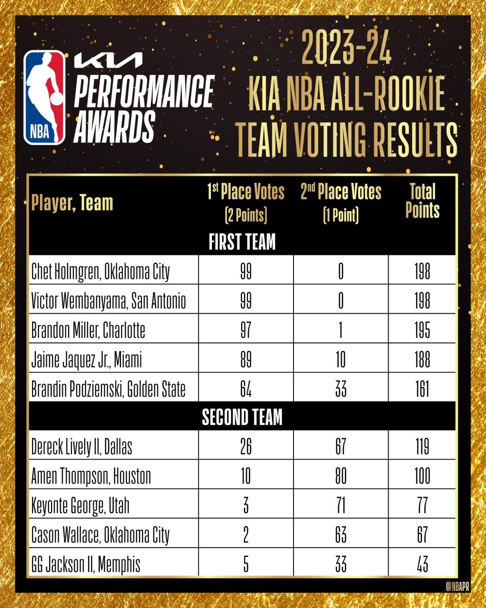 Pas vraiment de décisions surprenantes de la part des différents votants et cela nous laisse donc avec une « All-Rookie Second Team » composée de Keyonte George (Jazz), Cason Wallace (Thunder), GG Jackson II (Grizzlies), Amen Thompson (Rockets) et Dereck Lively II (Mavericks).