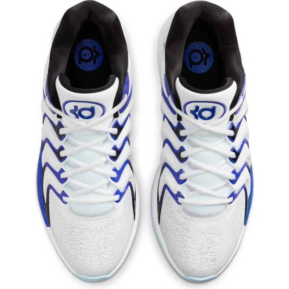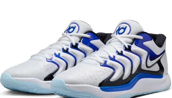 On retrouve donc une tige en mesh blanc assortie de renforts latéraux en TPU qui remontent jusqu’aux œillets entre noir et bleu marine, dans le style « Concord ». Sur l'empeigne extérieure, le « Swoosh » apparaît morcelé, comme sur la Penny 1. L'ensemble repose sur une semelle blanche et bleu translucide.