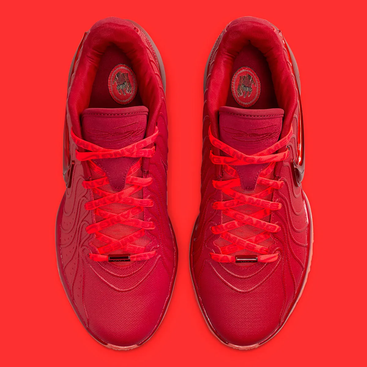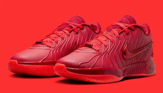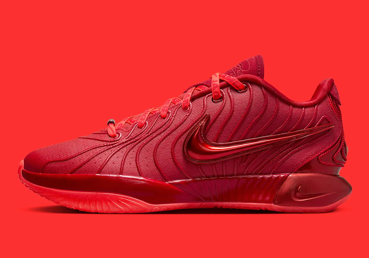 Ce 21e modèle signature arbore en effet une tige entièrement rouge, avec un « Swoosh » bombé (et brillant) ressortant sur l’empeigne extérieure et des câbles FlyWire également en rouge. On retrouve un teint rouge un poil plus clair pour orner la languette et la semelle extérieure. Les lacets sont quant à eux recouverts de l’inscription « James Gang ».