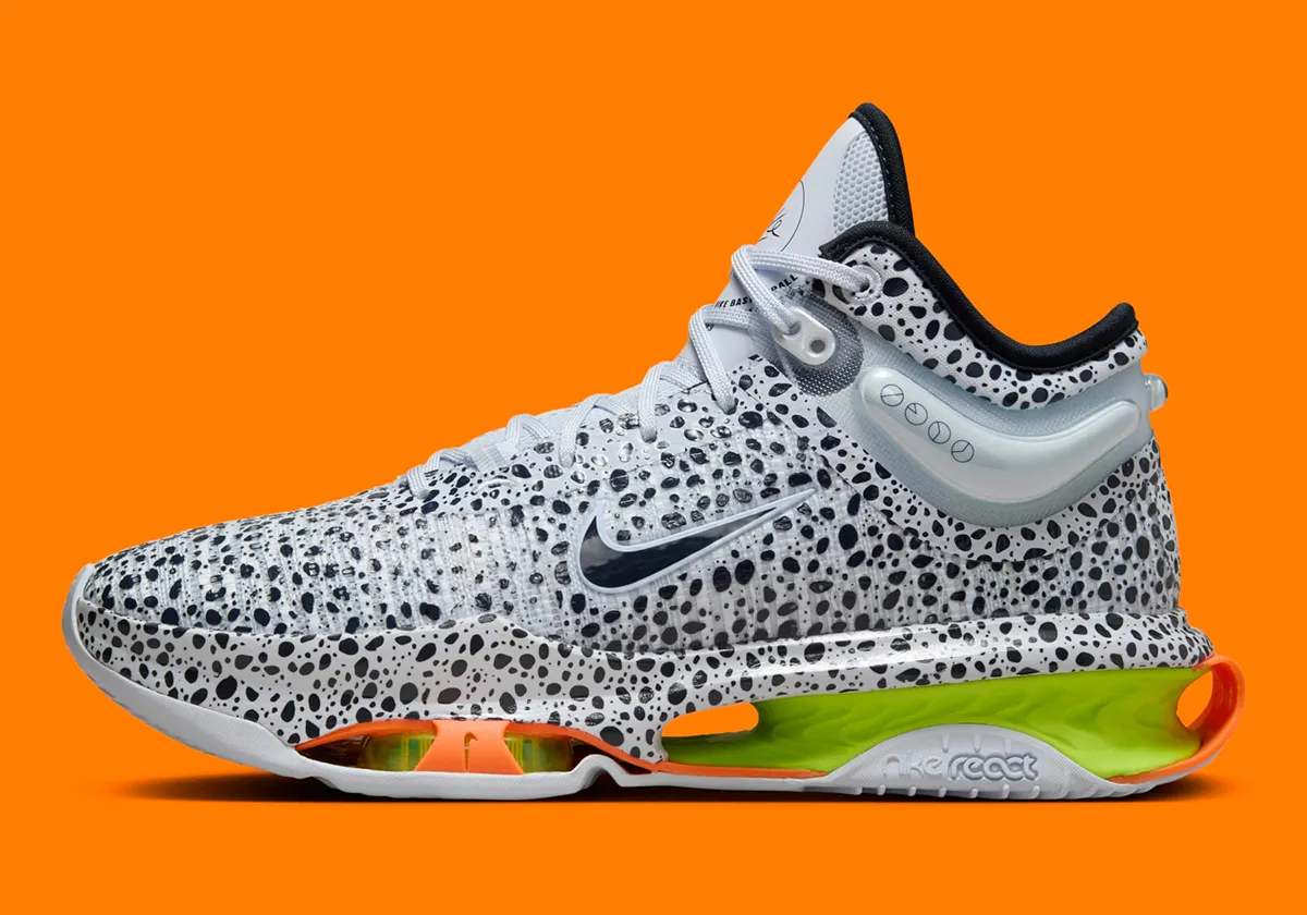 Il y a déjà eu la Nike GT Cut 3 « Community of Hoops », en clin d’œil au prochain rendez-vous parisien, et donc maintenant cette Nike GT Jump 2 « Safari », attendue autour des JO. La référence au monde olympique est moins évidente puisque la tige est recouverte d’un « imprimé animal » en noir et blanc, avec un « Swoosh » également en noir et blanc. L’ensemble est complété par des finitions en vert clair et orange au niveau de la semelle intermédiaire.