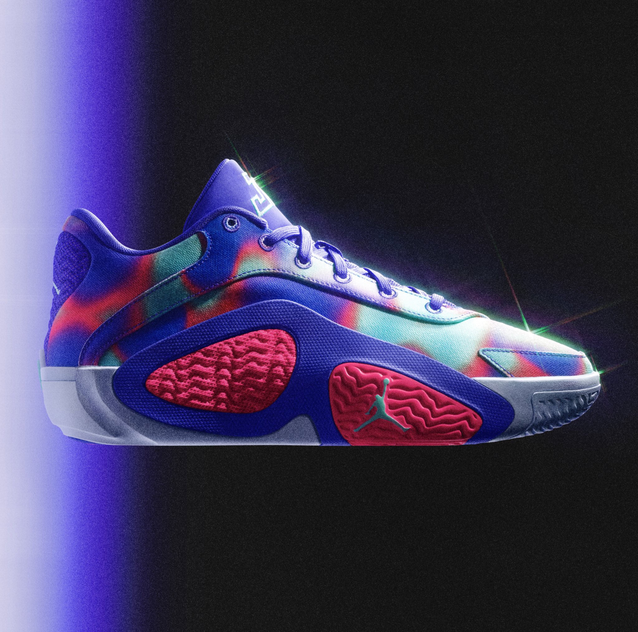 La partie supérieure de la tige, principalement en violet, est complétée par des touches de bleu turquoise et de rose. Les logos « Jumpman » et du joueur ressortent en bleu ciel sur la languette, le talon et la semelle. L’ensemble, symbolisant un coucher de soleil à Dongdan, repose sur une semelle extérieure blanche.