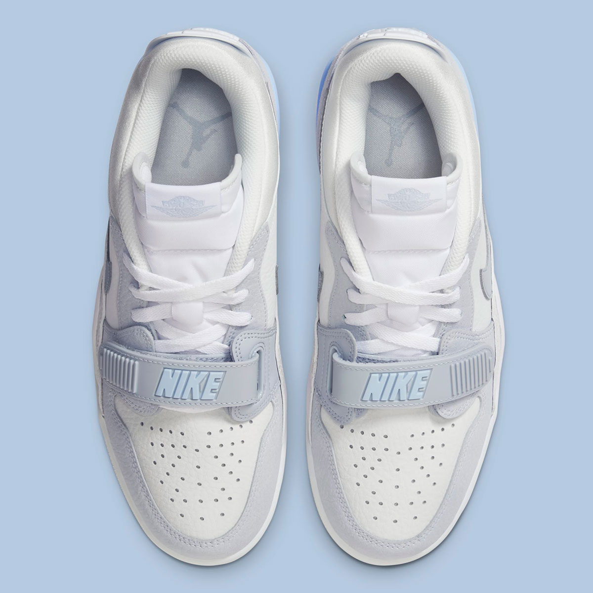 La tige blanche est ici assortie de superpositions en daim avec deux teintes de gris entre l’avant et l’arrière de la chaussure. Le logo Nike sur l’empeigne et le scratch recouvrant les lacets ressortent également en gris. Le léger clin d’œil au bleu « UNC » se trouve sur la partie arrière de la semelle intermédiaire, sur l’inscription « Nike » figurant sur le scratch et sur le « Jumpman » sur le talon.