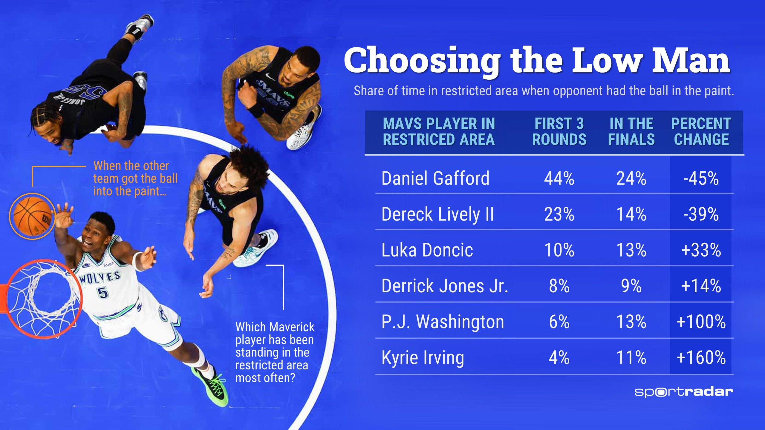 Une stratégie parfaitement illustrée par les stats de Todd Whitehead, de Synergy, qui a calculé le temps passé dans la raquette par les joueurs de Dallas lorsque les adversaires avaient le ballon.