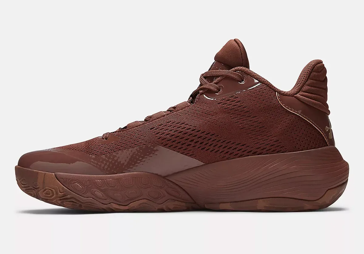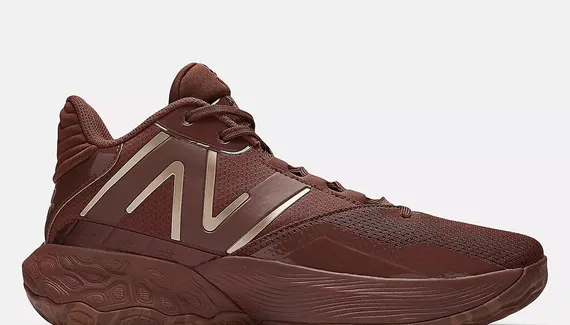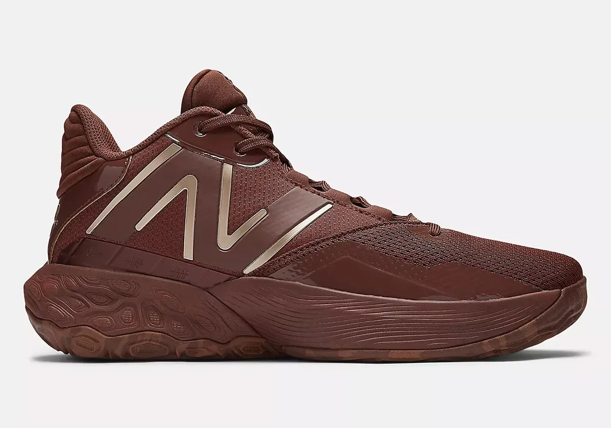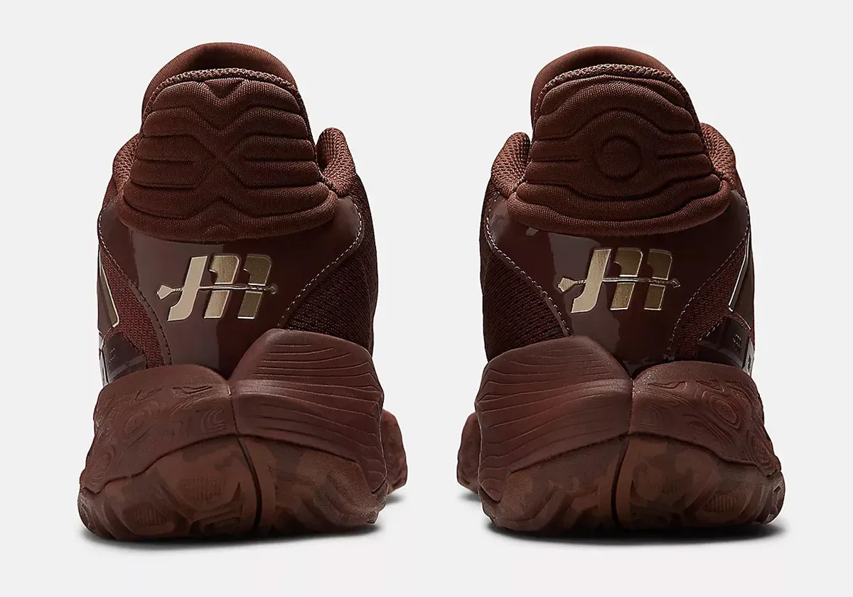 La tige arbore deux teintes de marron avec des finitions en doré. Les contours du logo New Balance sur l’empeigne apparaissent ainsi en doré. C’est également le cas du logo du meneur de Denver, un « JM » traversé par une flèche, présent sur le talon.