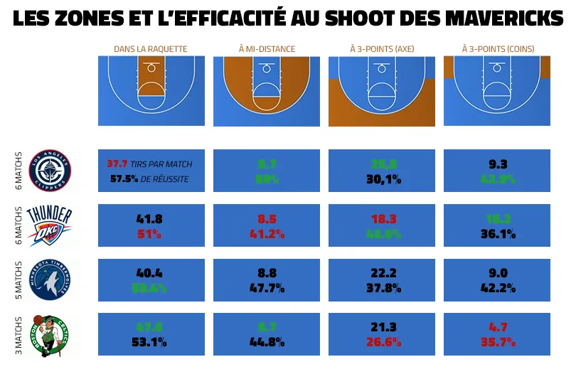 La défense de Boston fait tout pour empêcher les tirs à 3-points de Dallas dans les corners, l'endroit où la ligne est la plus proche du panier et là où ils étaient particulièrement efficaces. C'est une stratégie défensive qu'ils ont employée toute la saison mais elle est poussée à l'extrême lors de ces Finals.