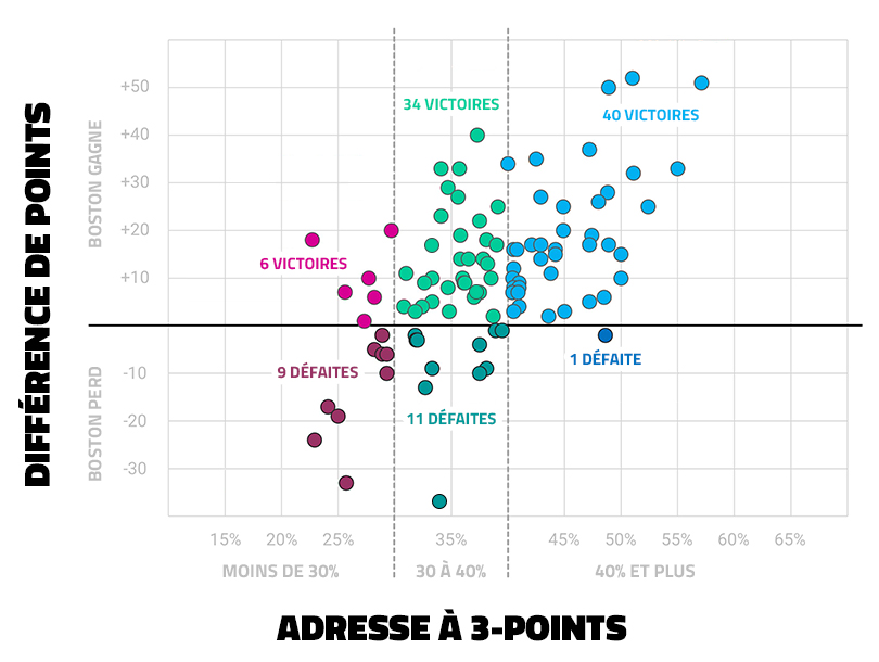 Forcément, avec un tel volume de 3-points, l’adresse de loin est un facteur clé dans les victoires de Boston.