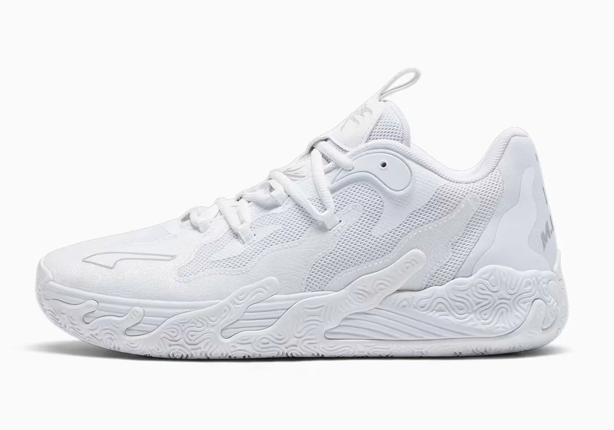 Ce nouveau coloris de la troisième chaussure signature de LaMelo Ball allie une tige aux différentes nuances de blanc à une semelle également blanche. On note quelques finitions en gris, sur la languette où figurent les inscriptions « Rare » et « NO.1 » ou sur le « M.E.L.O. » présent sur le talon.
