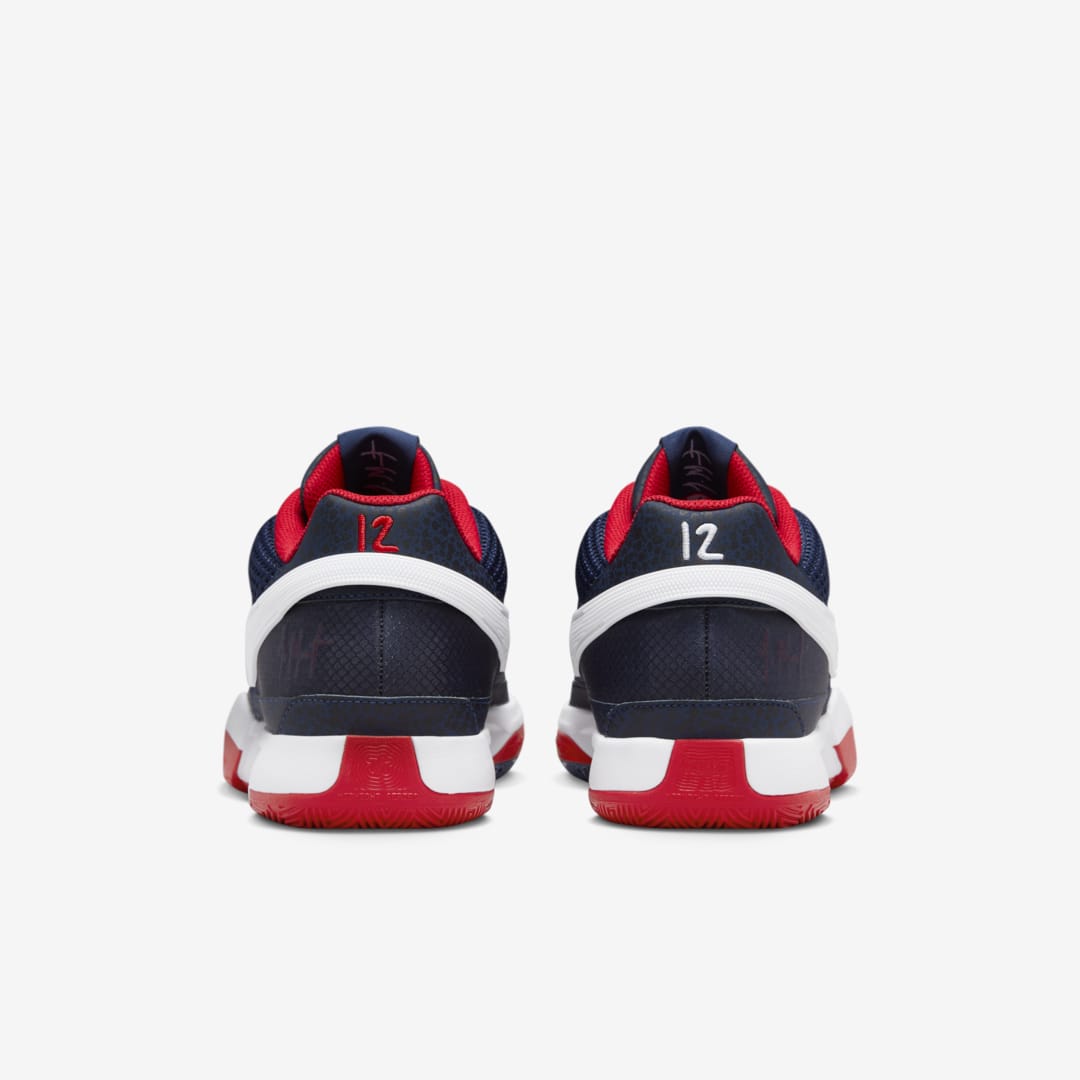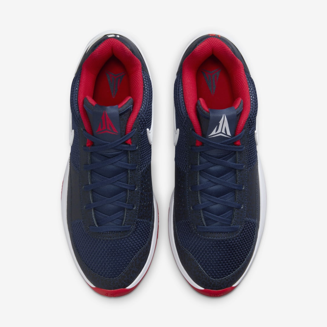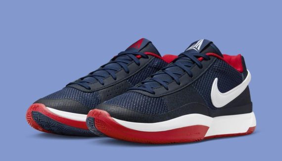 Voici cette fois deux modèles signatures parées aux couleurs de la bannière étoilée avec la Nike Ja 1 de Ja Morant et la KD 17 de Kevin Durant. La Ja 1 de Ja Morant, qui regardera la compétition à la télé, bénéficie ici d’une tige en bleu marine entre mesh et cuir, contrastée par un « Swoosh » blanc. Les finitions en rouge et blanc sont présentes sur la semelle et également au niveau du col et de la languette.