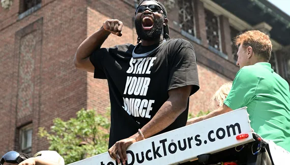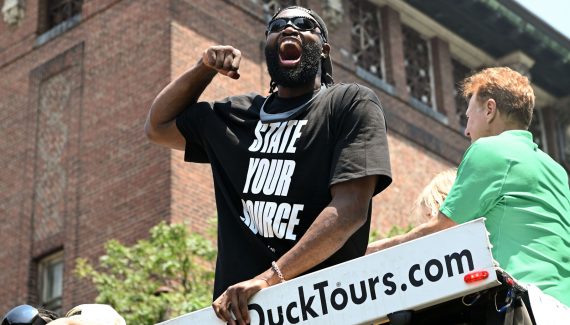 En attendant de recevoir sa première bague de champion NBA lors de la reprise de la NBA en octobre prochain, Jaylen Brown a profité de la parade pour fêter le 18e titre des Celtics afin de porter une bague de sa propre collection, personnalisée au nom de sa fondation “7uice”.