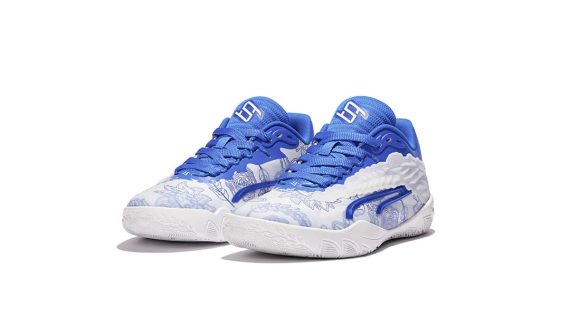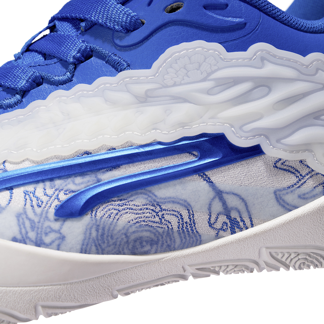 La tige ici en blanc et bleu est ornée de motifs floraux à sa base. L’ensemble repose sur une semelle extérieure blanche. Les logos de la joueuse et de la marque Puma apparaissent également en blanc sur fond bleu, respectivement sur la languette et le talon.