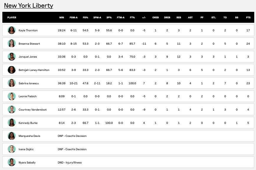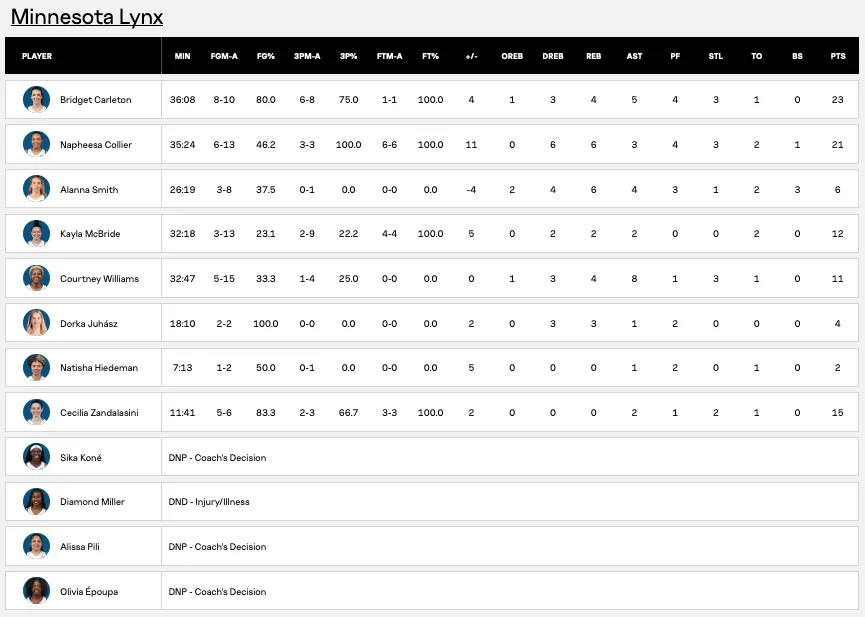 En volant des ballons, le Lynx a ainsi pu s'offrir pas mal de contre-attaques (20 à 6 dans le domaine) qui ont fait très mal au Liberty. D'autant que Minnesota a été particulièrement adroit de loin (14/29 dont 6/8 pour la seule Bridget Carleton) et a pu compter sur les paniers précieux de Cecilia Zandalasini en sortie de banc.