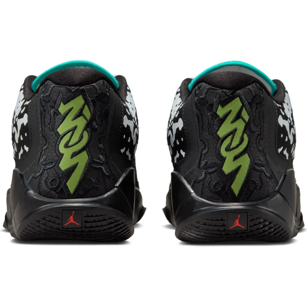 La tige principalement noire est tachetée de blanc dans un style à la « Venom ». La languette apparaît également en blanc avec un « Jumpman » marron doré et des contours en bleu turquoise. Au niveau du talon, on retrouve le logo du joueur ressortant en vert, avec également un nouveau « Jumpman », en rouge cette fois. L’ensemble repose sur une semelle extérieure en noir, avec des rappels en bleu ciel, et marron sous la semelle.