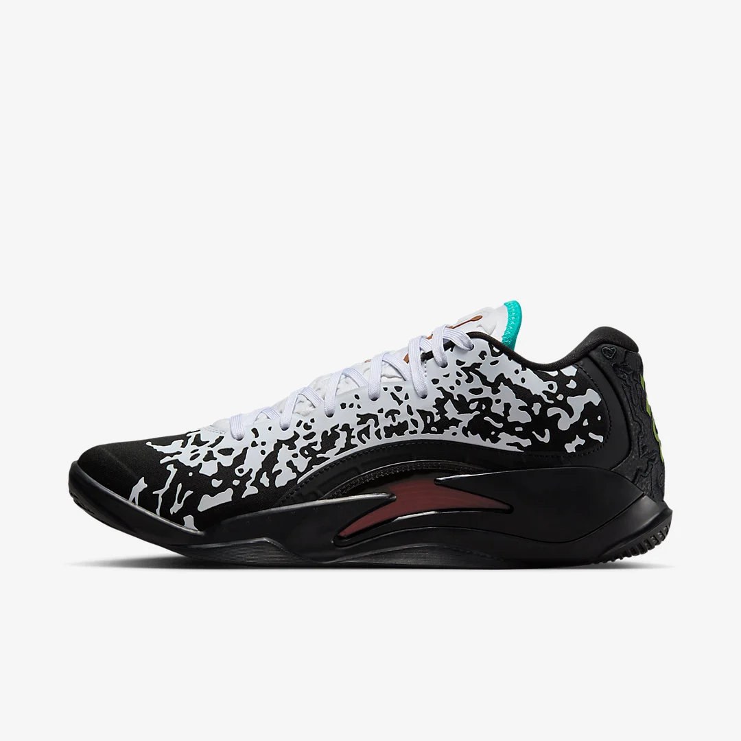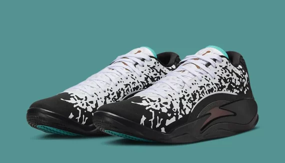 La tige principalement noire est tachetée de blanc dans un style à la « Venom ». La languette apparaît également en blanc avec un « Jumpman » marron doré et des contours en bleu turquoise. Au niveau du talon, on retrouve le logo du joueur ressortant en vert, avec également un nouveau « Jumpman », en rouge cette fois. L’ensemble repose sur une semelle extérieure en noir, avec des rappels en bleu ciel, et marron sous la semelle.