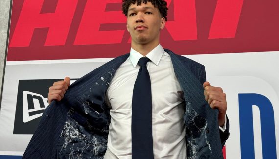 Habillé d’un costume bleu foncé « simple mais avec un air de businessman » et brodé à son nom avec la date de la Draft, l’ailier tricolore de 2m06 semble déjà dans son élément.