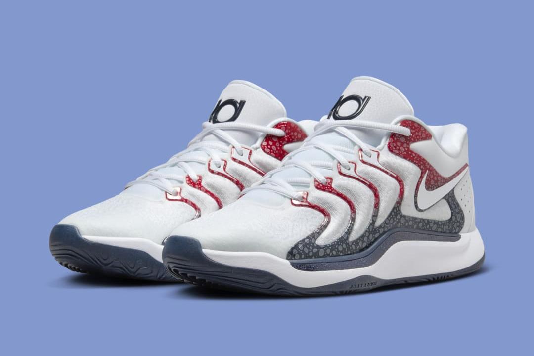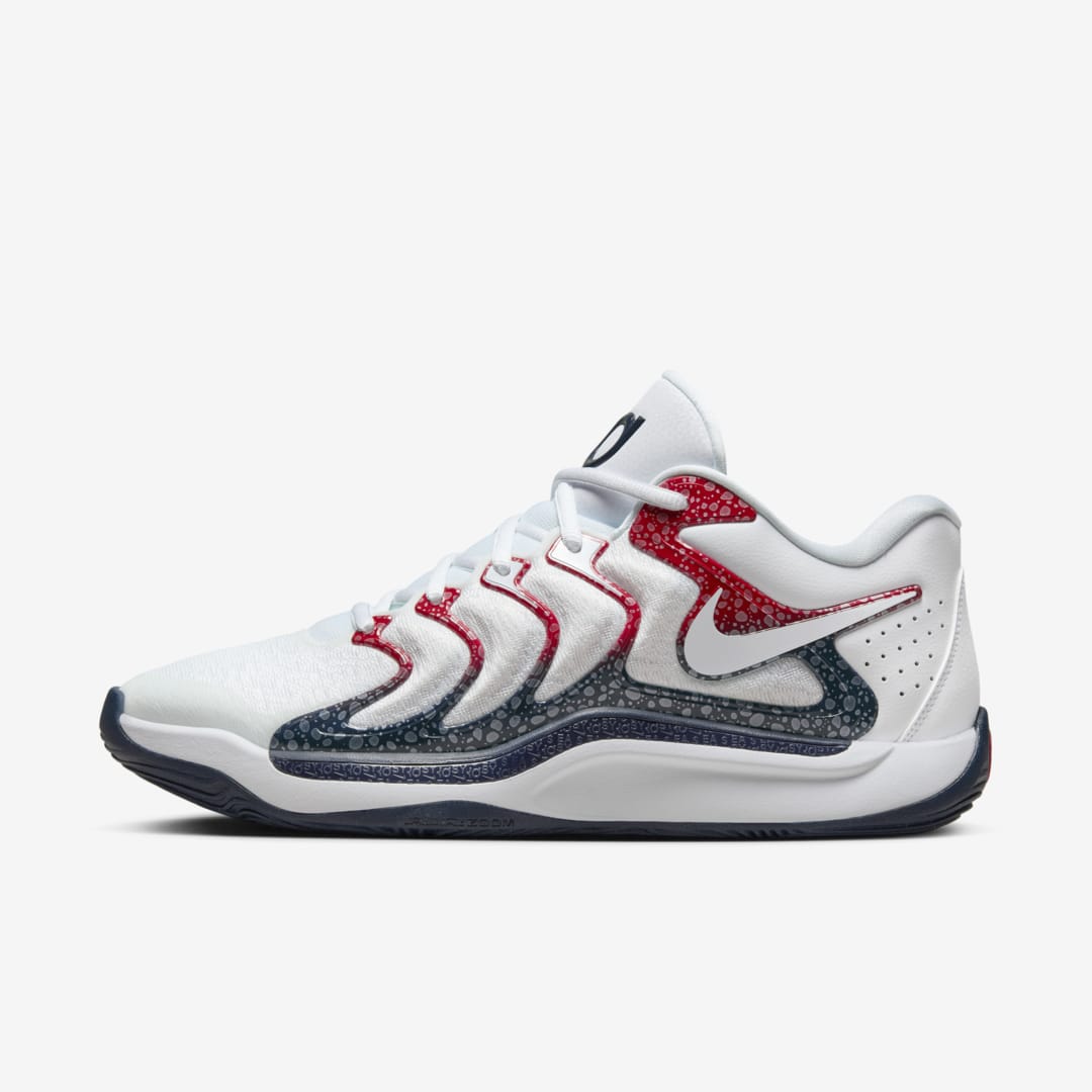 La KD 17 de Kevin Durant, sélectionné pour sa part avec Team USA, adopte un coloris plus clair, avec une tige blanche assortie de renforts latéraux en TPU allant du bleu marine au rouge. La semelle extérieure ressort en bleu marine et rouge, tandis que le logo du joueur apparaît sur la languette en bleu marine sur fond blanc.