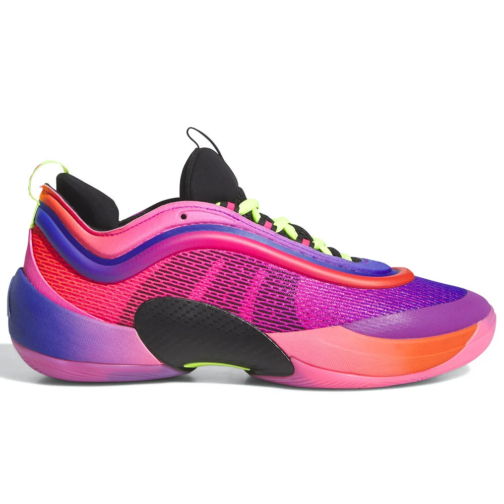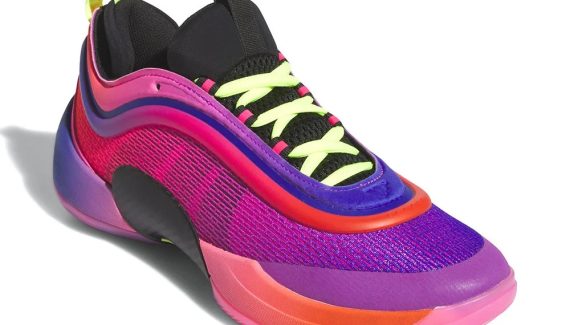 Pour ce nouveau modèle, adidas a opté pour un nouveau design, avec une tige en mesh superposée de renforts sur la partie supérieure. Pour cette première version, tout est question de dégradé, allant de l’orange au bleu nuit en passant par du rose et du violet au niveau de la tige. La semelle intermédiaire reprend le même code mais à l’inverse, l’arrière de la paire s’affichant en bleu nuit tandis que l’avant remonte progressivement jusqu’à l’orange.