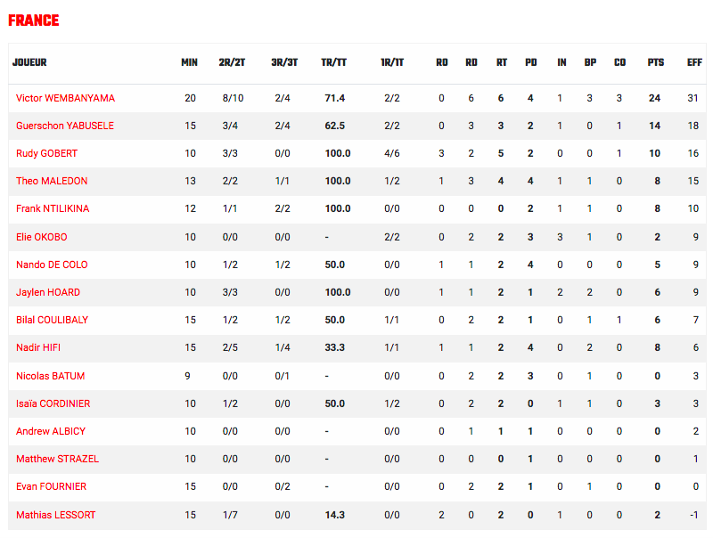 Si le jeu est un peu plus confus avec un cinq expérimental en fin de mi-temps, la France mène toutefois largement (50-28) après deux nouveaux alley-oop massifs pour Victor Wembanyama, dont un dunk arrière sur une passe laser de Batum. Wemby ajoute un tir à trois points, bientôt imité par Hifi au buzzer de la possession !