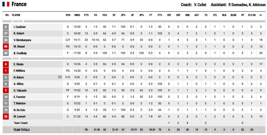 Dans ce match en faux-semblants, c’est l’Equipe de France, plus sérieuse et plus impliquée défensivement, qui s’en est sortie assez facilement (90-66). Bien aidée, il faut le dire, par une nouvelle performance stellaire de “Wemby”, auteur de 25 points dont 5/9 à 3-points, 5 rebonds.