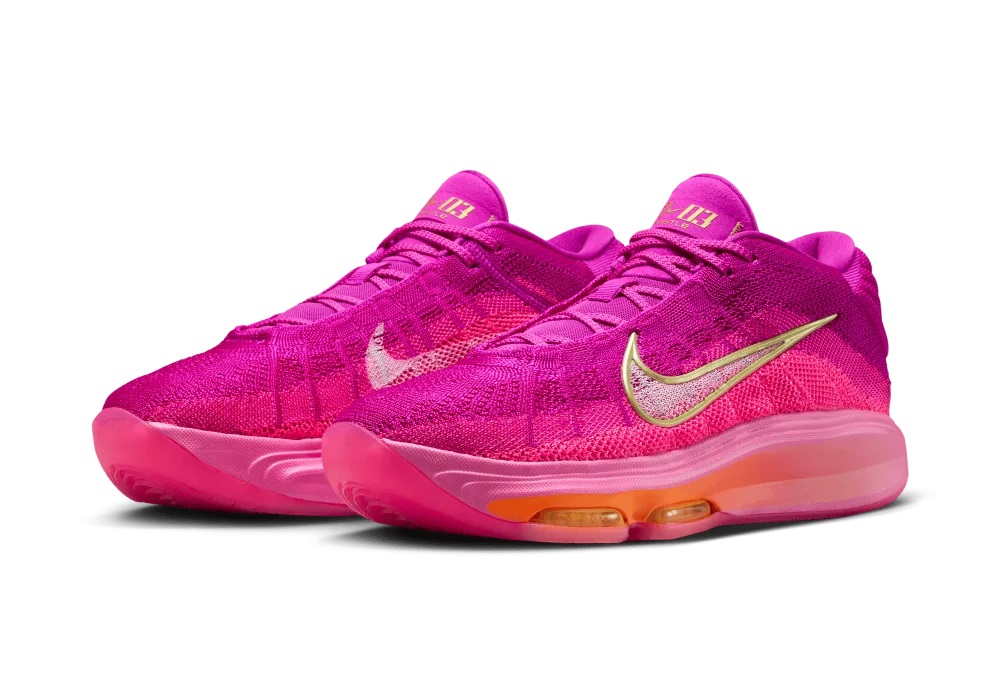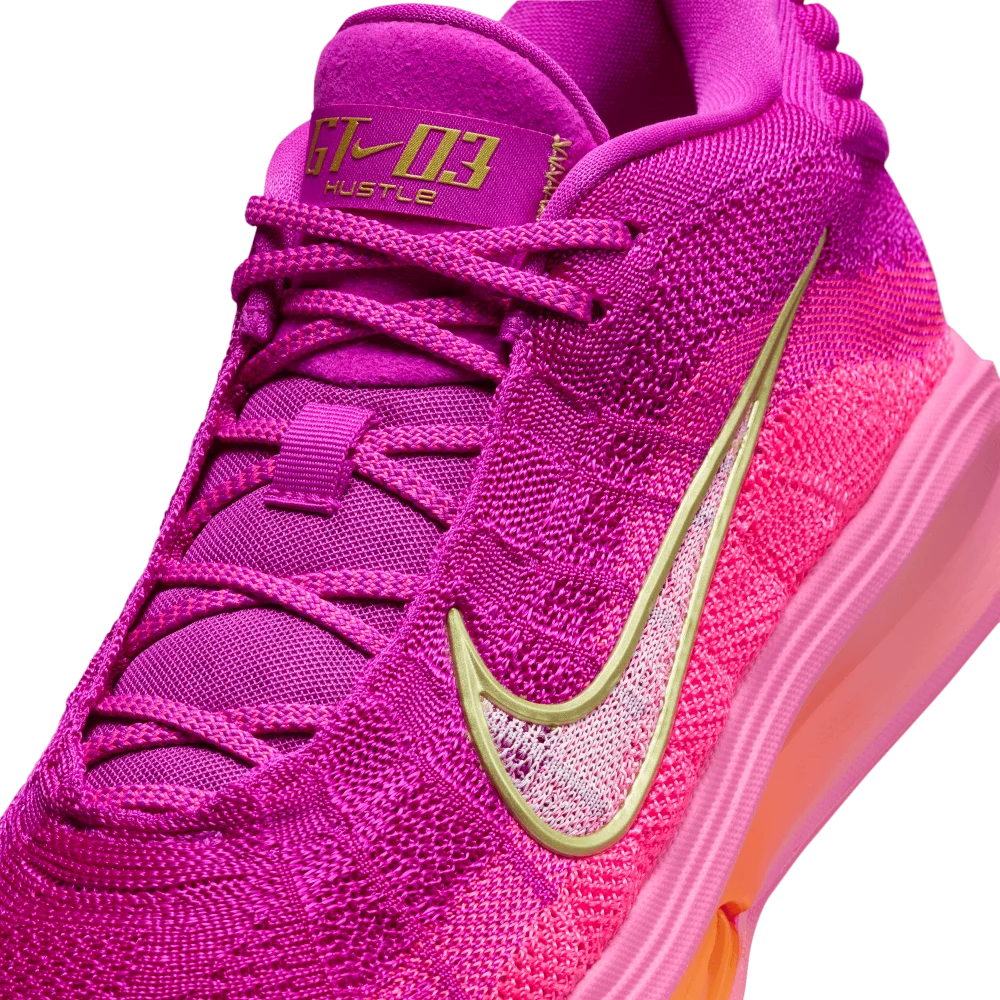 Côté design, Nike est revenu à du classique après avoir osé davantage sur la Nike GT Hustle 2. La tige en mesh, oscille ici entre rose et violet, avec un Swoosh blanc tandis que la semelle intermédiaire offre un dégradé allant du rose à l’orange.