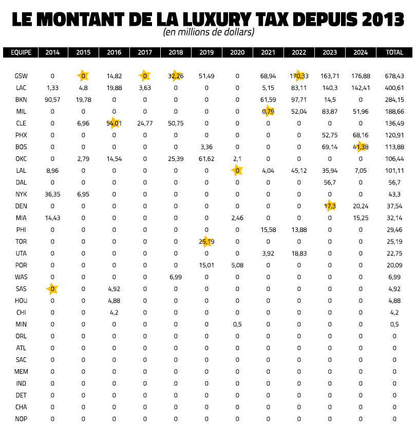 En plus de cette “luxury tax” record, les Suns vont ainsi devenir la première équipe à dépenser plus de 400 millions de dollars (223 millions en salaire + 205 millions en “luxury tax”) pour payer ses joueurs…
