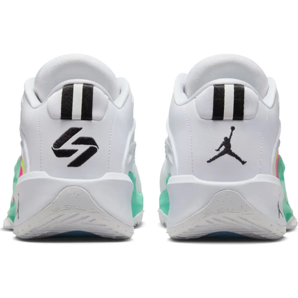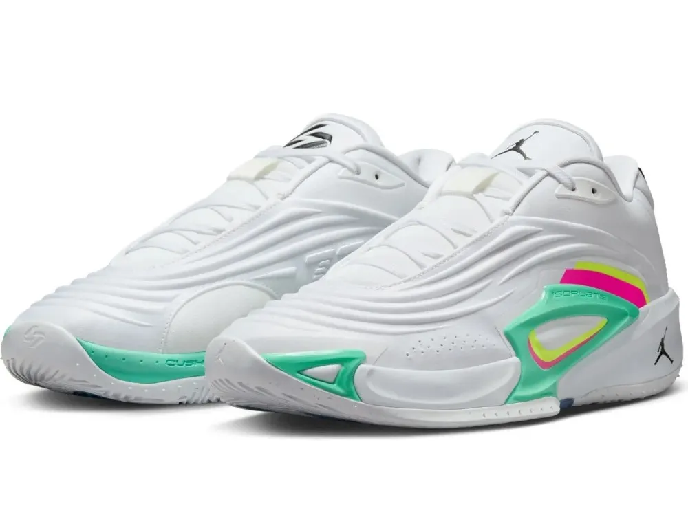 Celui-ci se présente avec une tige blanche, des finitions en noir pour faire ressortir le “Jumpman” et le logo du joueur sur la languette, ainsi que sur deux bandes sur le talon, peut-être pour refléter le drapeau à damier suggérant la ligne d'arrivée d'une course. La base de l'empeigne et l'avant du pied sont complétés par des bandes de TPU pour apporter plus de maintien et de stabilité, apparaissant ici en vert, rose et jaune fluo.