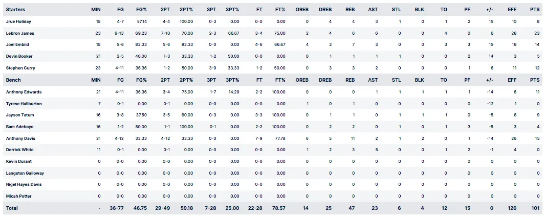 Le retour des titulaires ne casse pas la dynamique américaine, avec LeBron James qui n'a clairement pas envie de perdre ce match. Stephen Curry trouve enfin la mire de loin, dont un tir du logo, et les Etats-Unis semblent avoir remis les choses en place après trois quart-temps (81-76), en ayant remporté la période 37 à 18 !