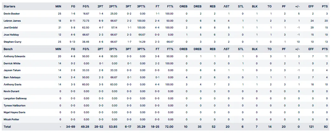 Comme face au Soudan du Sud, la sélection américaine laisse des ouvertures dans l'axe du panier, les rotations étant trop lentes à revenir. Joel Embiid place tout de même un énorme contre sur Isaac Bonga, qu'Anthony Edwards bonifie de l'autre côté. Et Team USA est toujours en tête (48-41) à la mi-temps, sans parvenir à prendre le large.