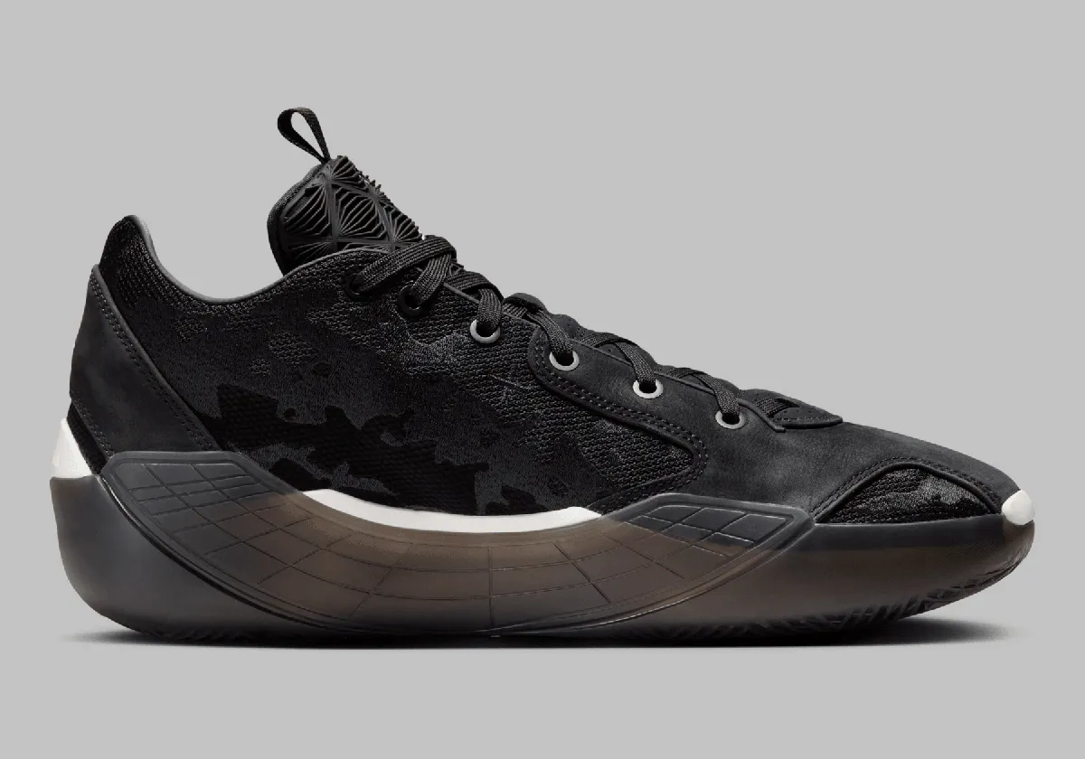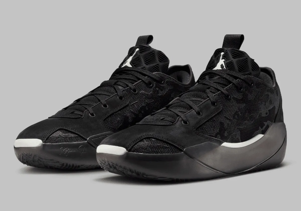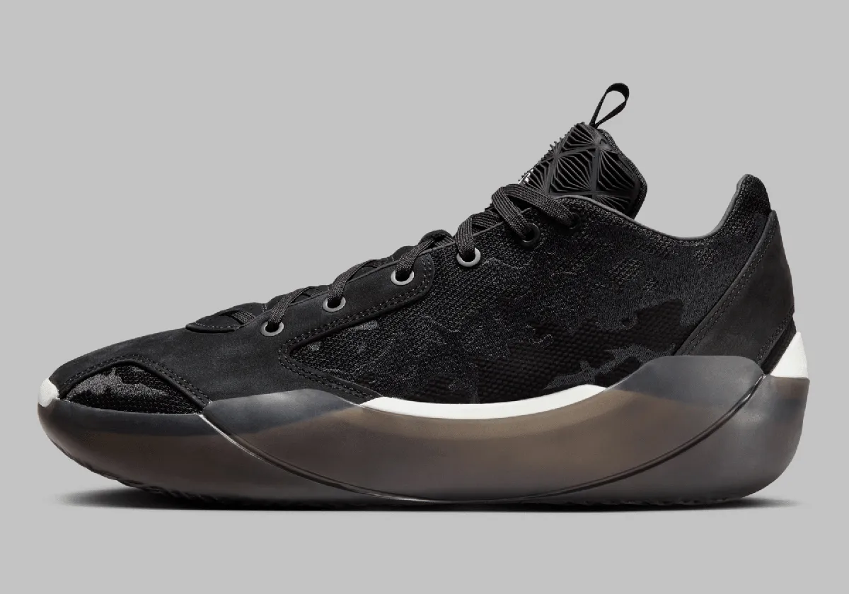 Baptisé « Lumière », celui-ci est composé d’une tige entre mesh et daim noir. Seul le logo « Jumpman » sur la languette et la semelle extérieure ressortent en blanc, sur une semelle extérieure noire translucide.