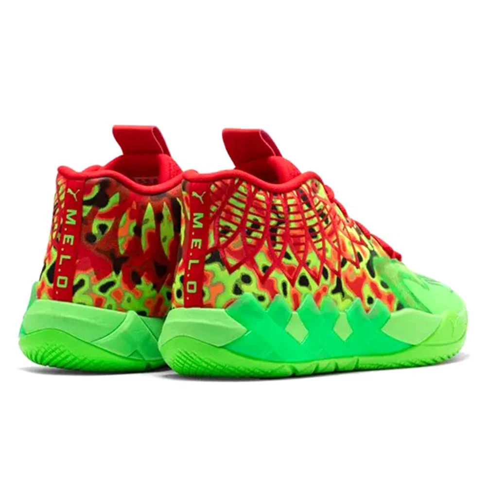 Cette fois, c’est une version « Thermal » que propose Puma, avec un style « Weatherman » sur sa tige habillée de motifs thermiques oscillant entre le rouge-orange, le noir et le vert clair. L’ensemble est complété par une bonne dose de vert fluo, pour faire ressortir la semelle notamment, tandis que la partie supérieure de la chaussure tend davantage vers le rouge-orange, avec logos et inscriptions en jaune.